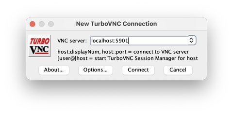 Launch your VNC client (in this example TurboVNC) and use http://localhost:5901 as the VNC server.