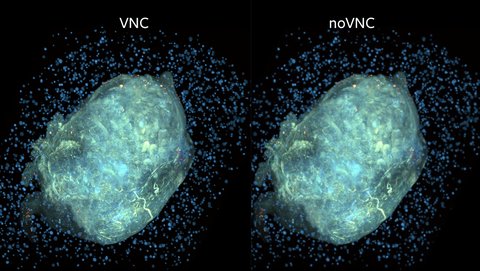 The image below shows the different graphics quality when visualizing a sample in Napari between VNC (left) and noVNC (right).
