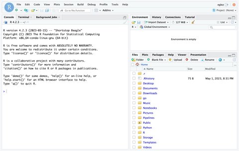 By default RStudio uses the R interpreter located in /soft/conda/envs/renv/bin/R. You can define another R interpreter, e.g. if you have installed R in your own environment, adding a line to the file in $HOME/.Renviron with the location of the R executable to use: