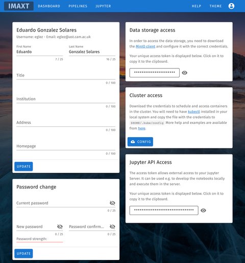 In the user profile page change password and access tokens needed to connect to the storage, Jupyter API or to run custom Docker images in the cluster.